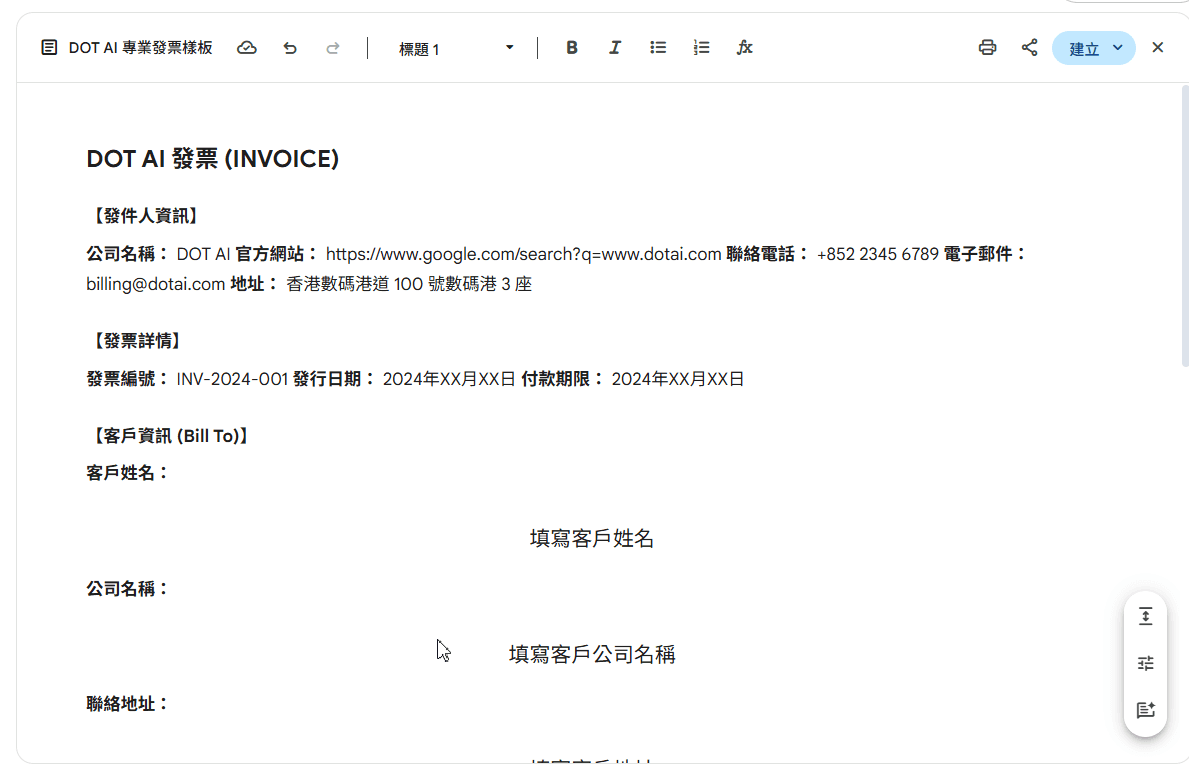 生成成品:格式工整、計算準確,且具備專業排版的商業 Invoice,可直接匯出交付客戶。