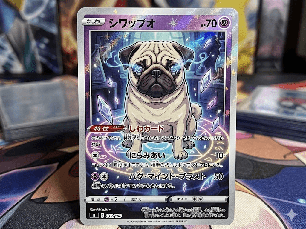 生成成品:精準保留八哥犬特徵的日系動漫風格角色卡牌,並自動生成遊戲化排版與數值框架。