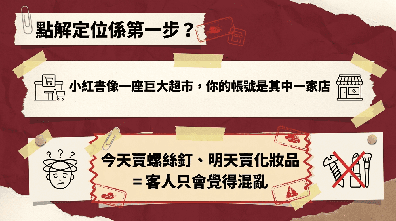 小紅書就像一座巨大超市——你的帳號是其中一家店。如果今天賣螺絲釘、明天賣化妝品、後天幫人算命,客人只會覺得混亂,下次想買東西時,絕對不會第一個想起你。定位,就是決定你在這座超市裡賣什麼、賣給誰。