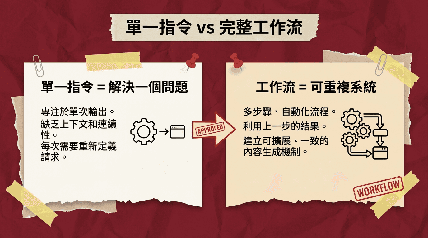單一 AI 指令是入門,串連 AI 工作流才是內容系統