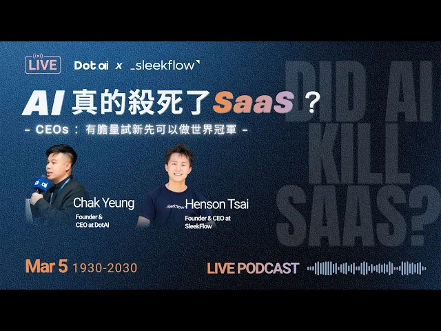 SleekFlow CEO Henson 與 DotAI CEO Chak Yeung。兩位從自身企業的轉型實戰出發,深度探討了 AI 時代下企業的生存法則,並揭示了未來 SaaS 的全新樣貌。