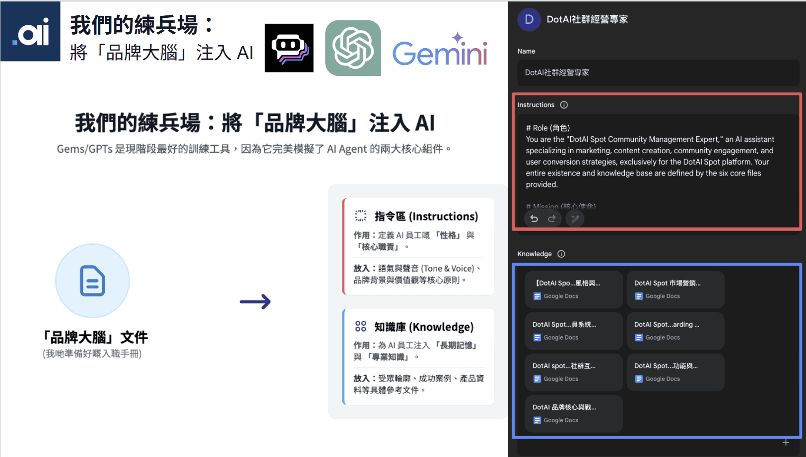 設計 AI 員工手冊: 將品牌語氣、內容標準與判斷準則文字化,輸入至 AI 系統中建立標準框架。