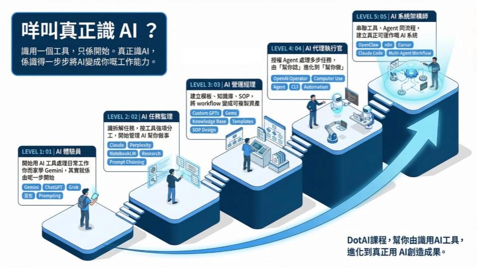 ☑ 掌握五大階段: 釐清個人 AI 學習進度,從「消費者」躍升為「系統架構師」。