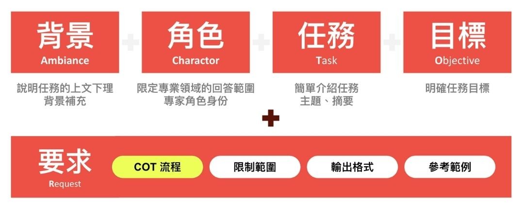 DotAI 的方法結合了「完整結構」與「清晰流程」:結構上,用**【背景、角色、任務、目標、要求】**五大元素,為 AI 準備一份零死角的「工作簡報」;流程上,再透過「CoT 思維鏈」,教 AI 一步步思考和推導,穩定地拿到你想要的高品質結果。