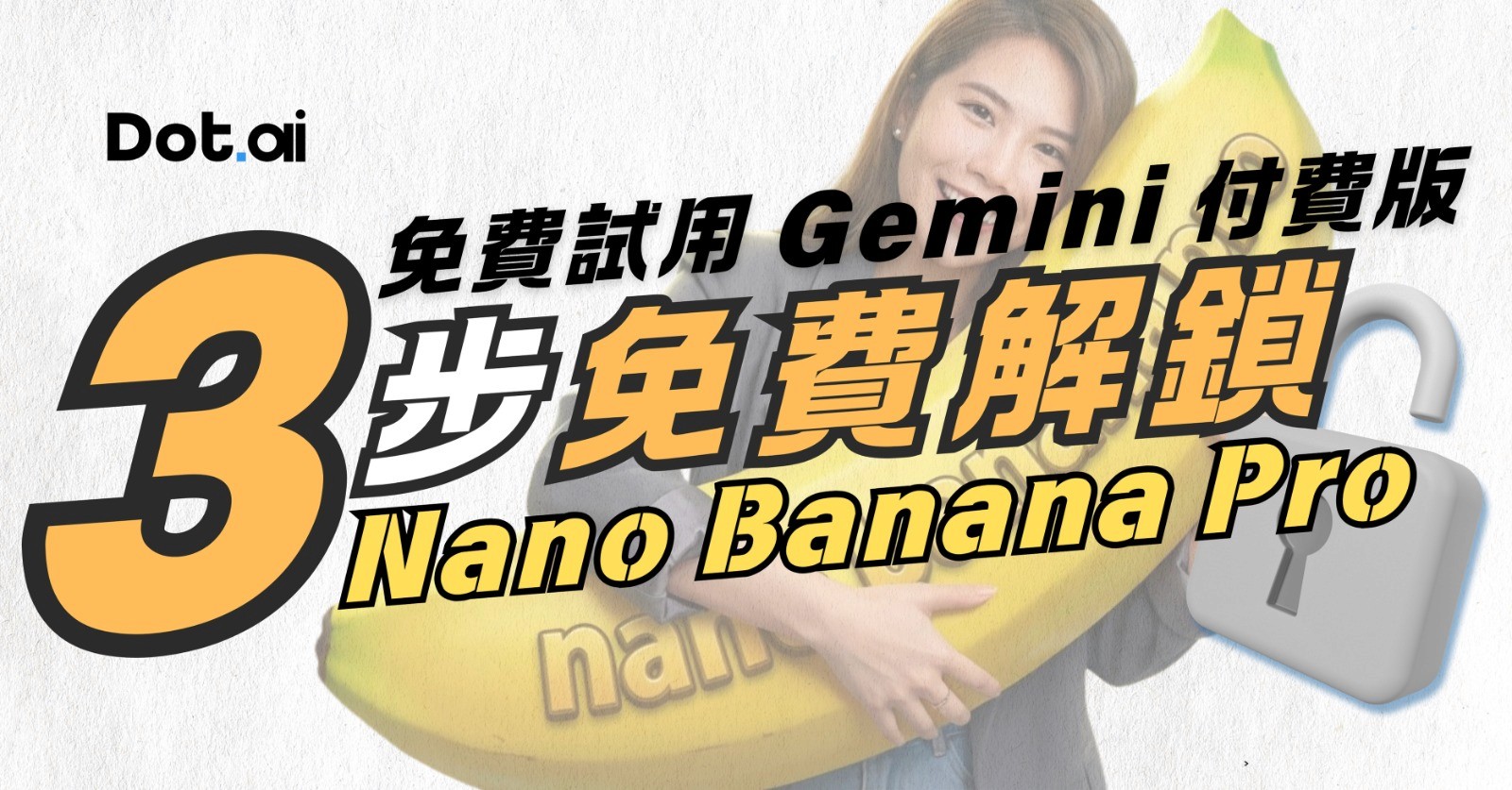 想免費玩 Nano Banana Pro?DotAI 教你無需信用卡、用 Gmail 即可申請 30 日 Gemini pro試用!無限額度生成 4K 產品圖,解鎖 AI Agent 功能。內附申請教學與獨家 AI 廣告量產工作流推薦。