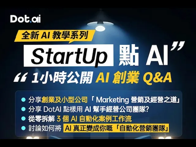 【___ 點AI 系列】作為每月一次的免費直播活動,旨在匯聚各領域專家,共同探討 AI 應用的無限可能。而於 11月6日 成功舉辦的Startup 點 AI,正是此系列的首集。本集活動深入探討了創業路上的種種挑戰與機遇,特別邀請 DotAI 團隊內部的 Marketing Team 成員參與討論,包括:DotAI CMO - Jimmy 、DotAI Marketing Manager - TC 以及DotAI 自動化專家 - 馬可。