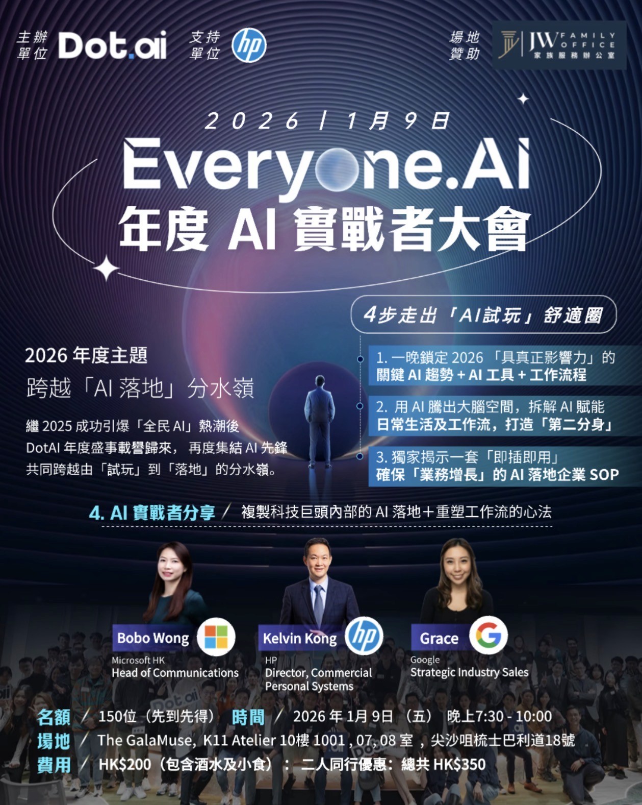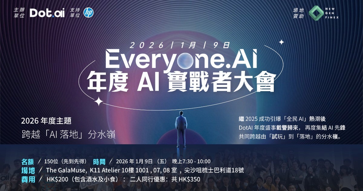 現在,Everyone.AI 2026 正式向全港發出召集令 。這場將於 2026 年 1 月 9 日(星期五)回到熟悉的 K11 ATELIER 10 樓 The GalaMuse 舉行的年度 AI 大會,專為相信 "Big Change"、不甘於現狀的實戰者而設 。