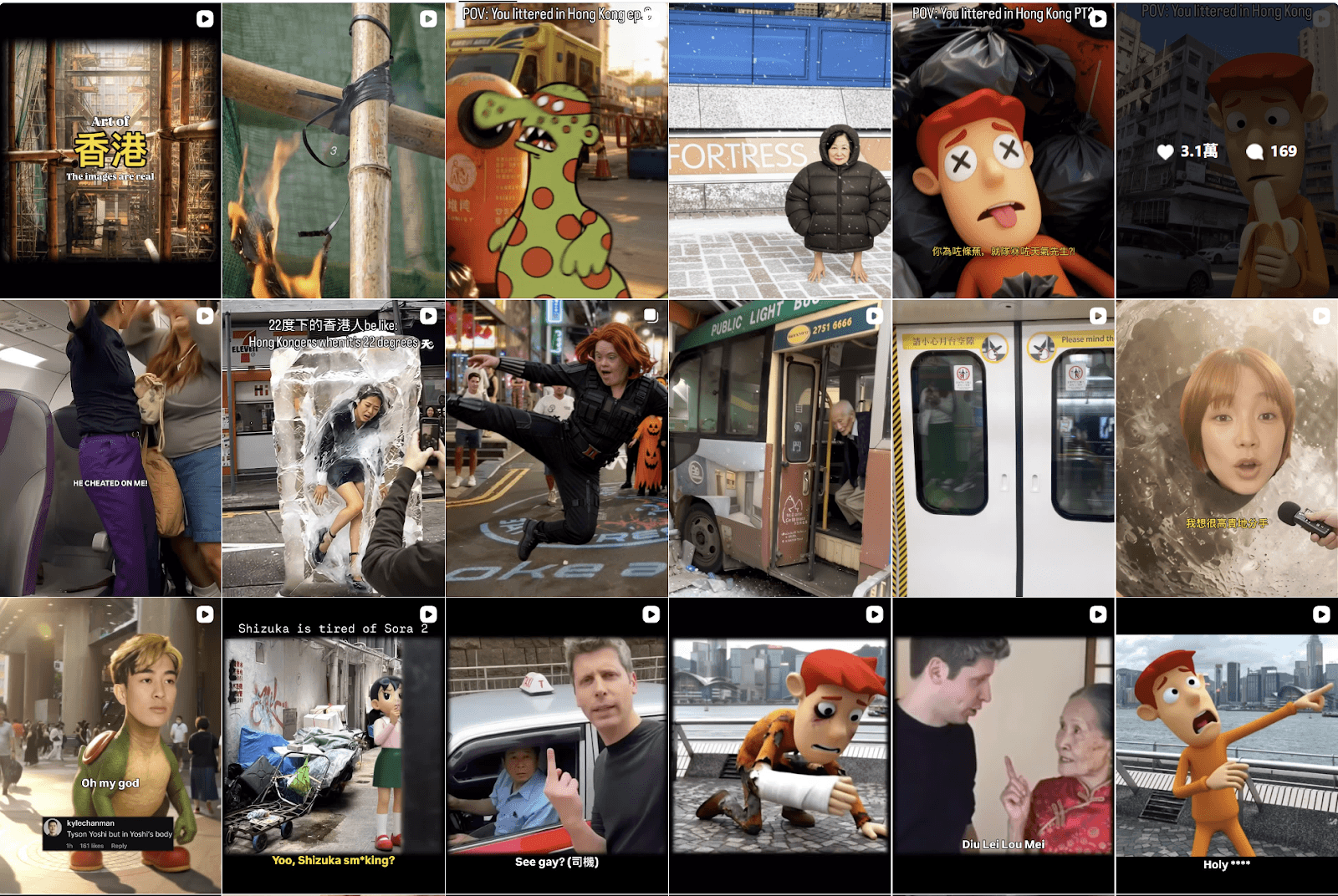 UnrealHK 感覺是一位隱身於 AI 背後的創意導演。他擅長捕捉香港人熟悉的日常場景——從颱風天下的眾生相、擁擠的港鐵 (MTR) 到經典角色的惡搞短劇。他熟練運用 Sora、Veo 等先進視訊模型,將這些本土文化符號轉化為極具娛樂性與共鳴感的 AI 短片。