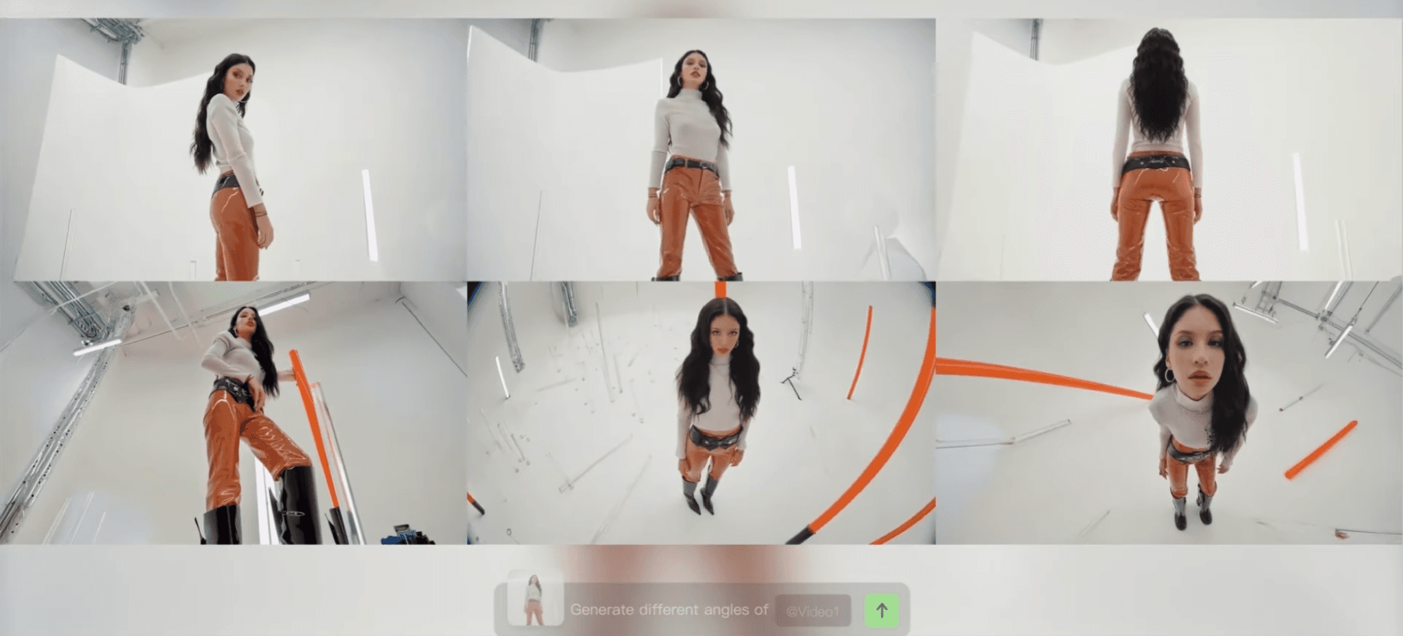 DotAI 易明比喻:像下方案例,所上傳的素材是單一視角的視頻素材,輸入‘多視角視頻生成’的需求後,會顯示下方的六個不同角度拍攝的視頻,而人物形象在六支影片中高度一致。