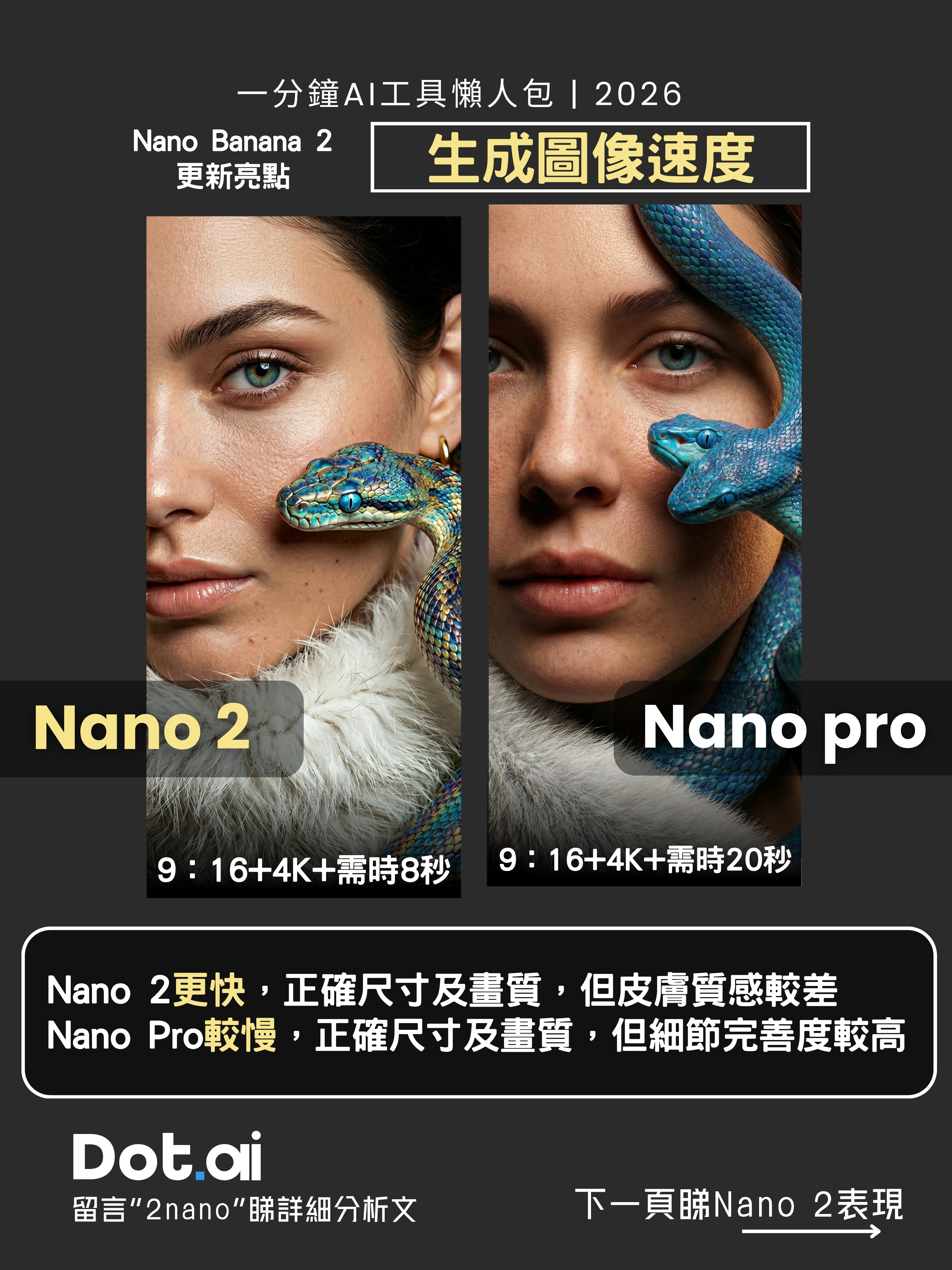 表現分析: Nano Banana 2 生成更快,能正確處理尺寸及畫質,但在人物皮膚等細微質感上較為遜色;相對而言,Nano Banana Pro 雖然生成較慢,同樣能確保正確尺寸與畫質,但其細節完善度極高。實務上建議先以 Nano 2 快速起稿,再以 Pro 版精修。