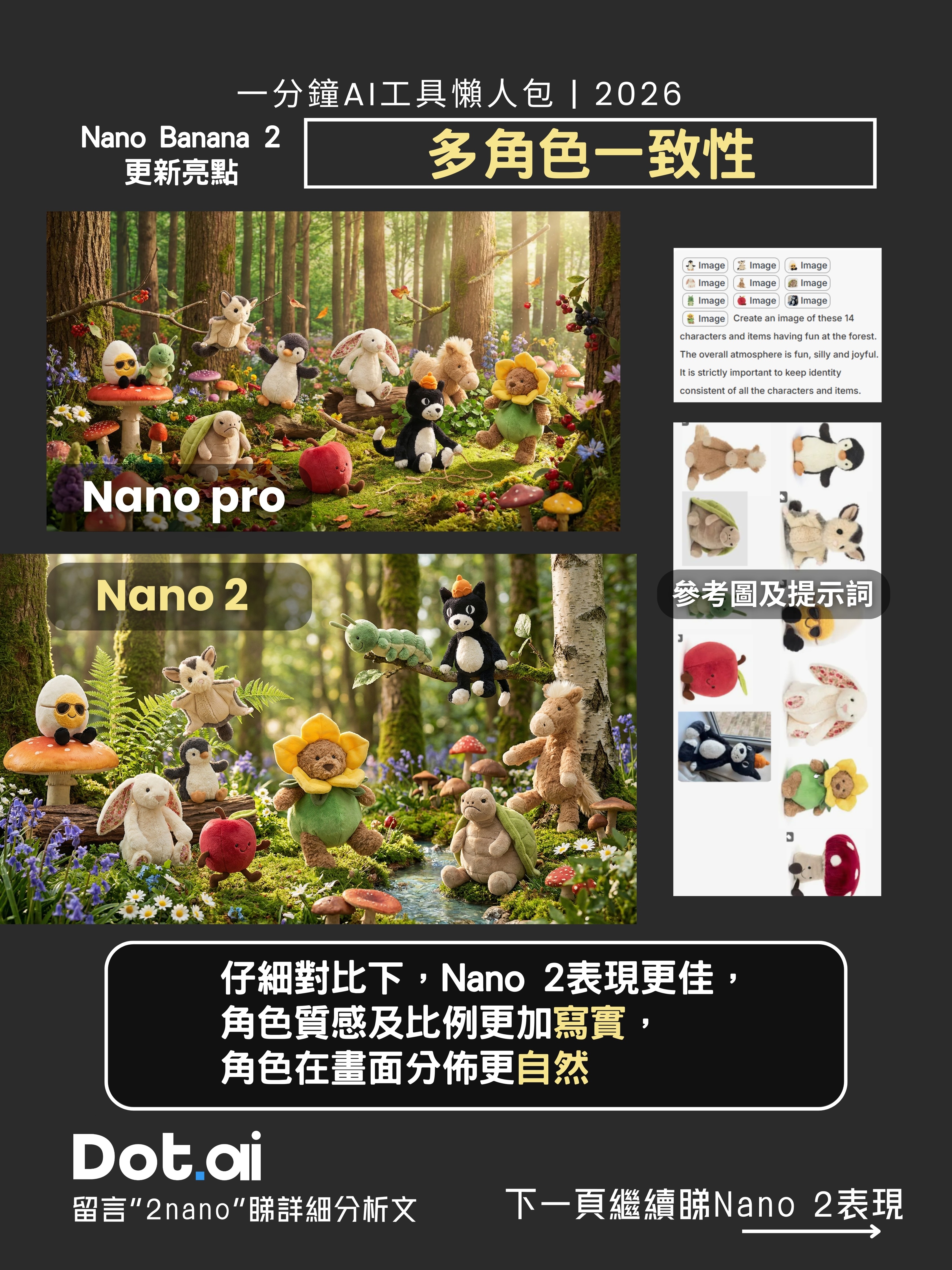 表現分析: 仔細對比下,Nano Banana 2 生成的角色質感及比例更加寫實,且多個角色在畫面中的分佈顯得更為自然;相較之下,兩者雖都能維持一致性,但 Nano 2 在群體構圖的協調性上表現亮眼。