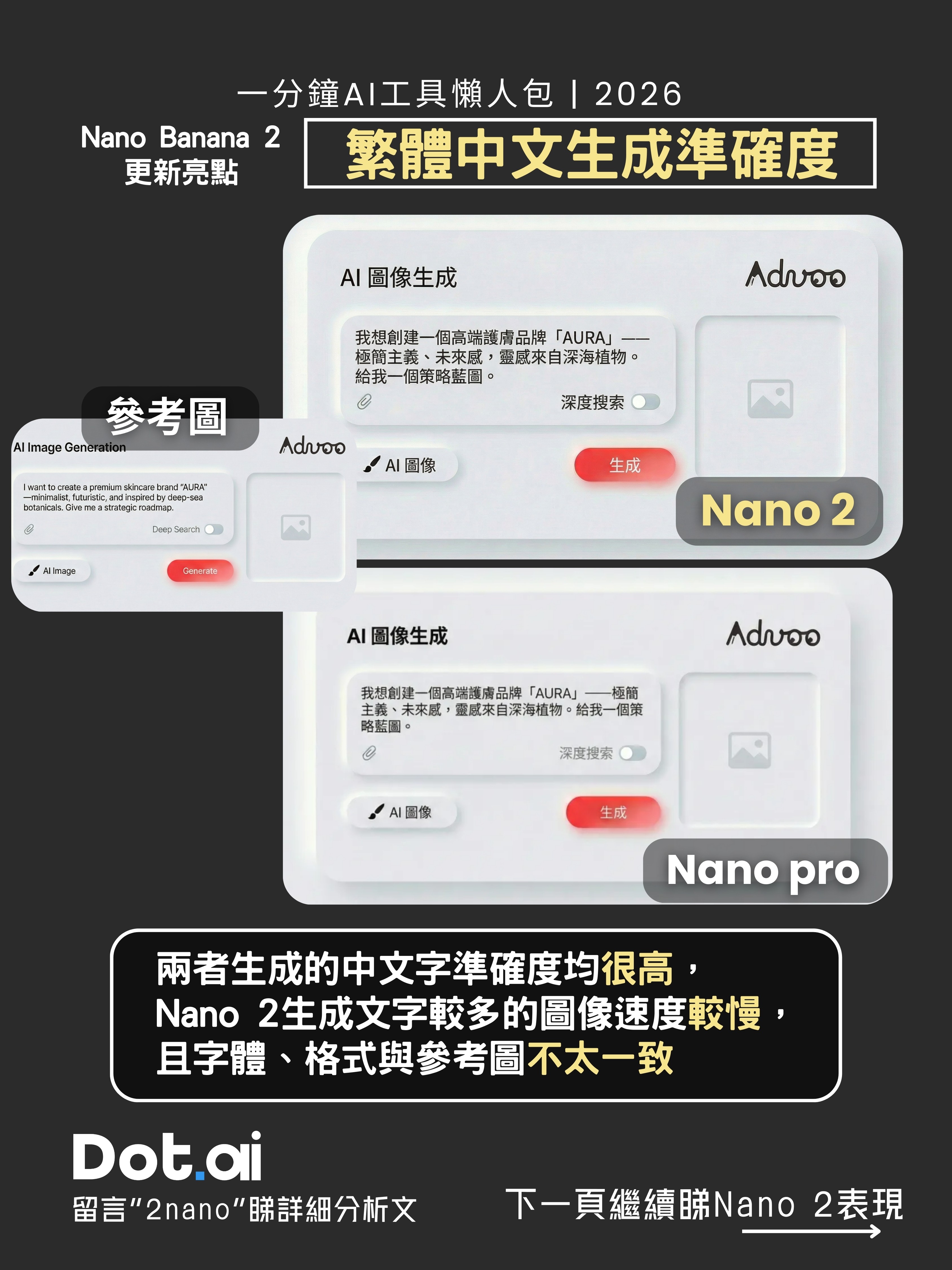 表現分析: 實測顯示,兩者生成中文字的準確度均非常高,Nano 2生成的字體、格式與參考圖不太一致,而測試下來當要求 Nano Banana 2 生成包含較多文字的圖像時,其生成速度會相對變慢,需預留稍多運算時間。