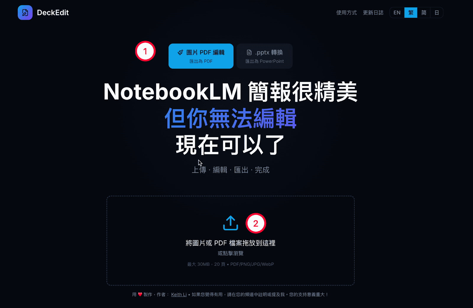 為了解決這個痛點,我們實測了由香港開發者 李勁華 Keith Li 創建的救星工具 DeckEdit。這是一個秉持「隱私優先」使命的 Vibe Code 項目,讓修改 AI 簡報不再需要手動重打。