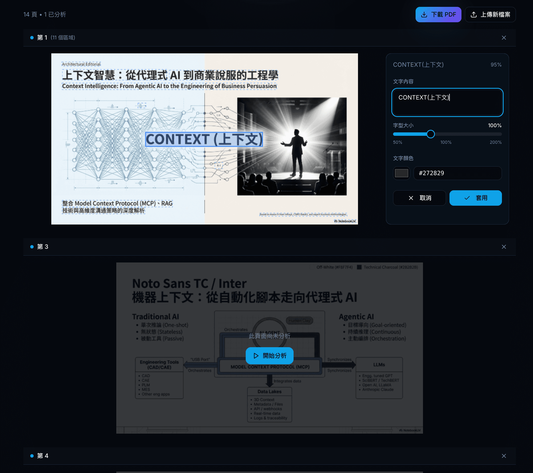 系統會自動分析頁面中的圖像與文字層次,將原本鎖死的像素轉化為可移動、可選取的物件。