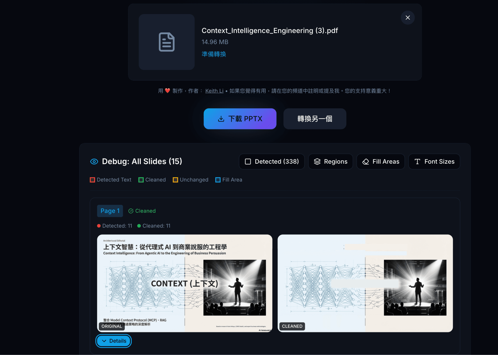 100% 本地 OCR 偵測:利用瀏覽器內建 AI 偵測簡報、投影片或資訊圖表中的每一段文字,直接編輯或刪除。