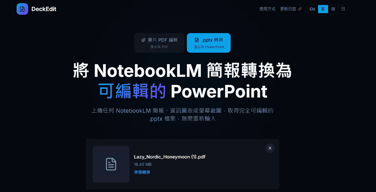 進入 DeckEdit 官網,將您的 PDF、PNG、JPEG 或 WebP 檔案拖放到上傳區。