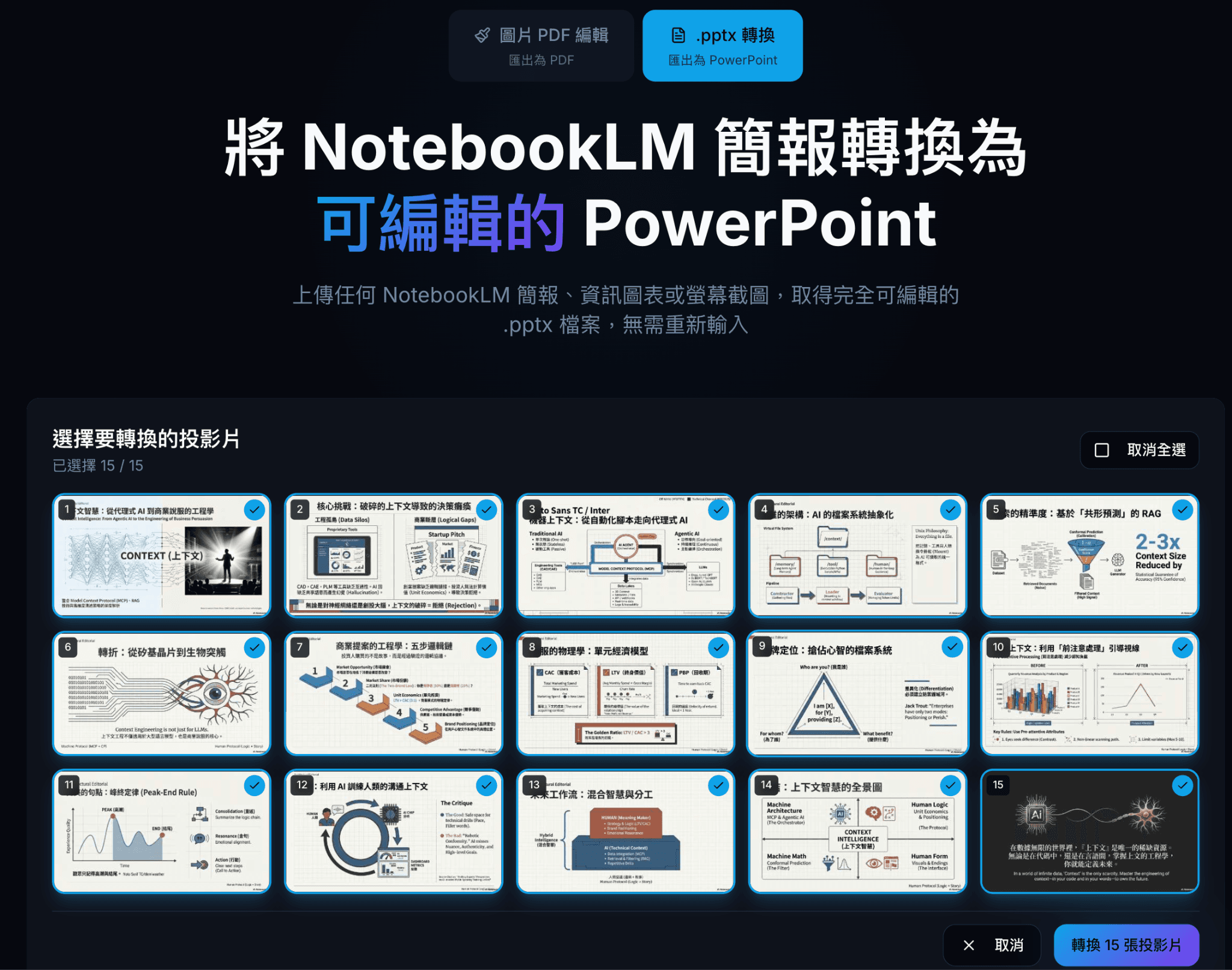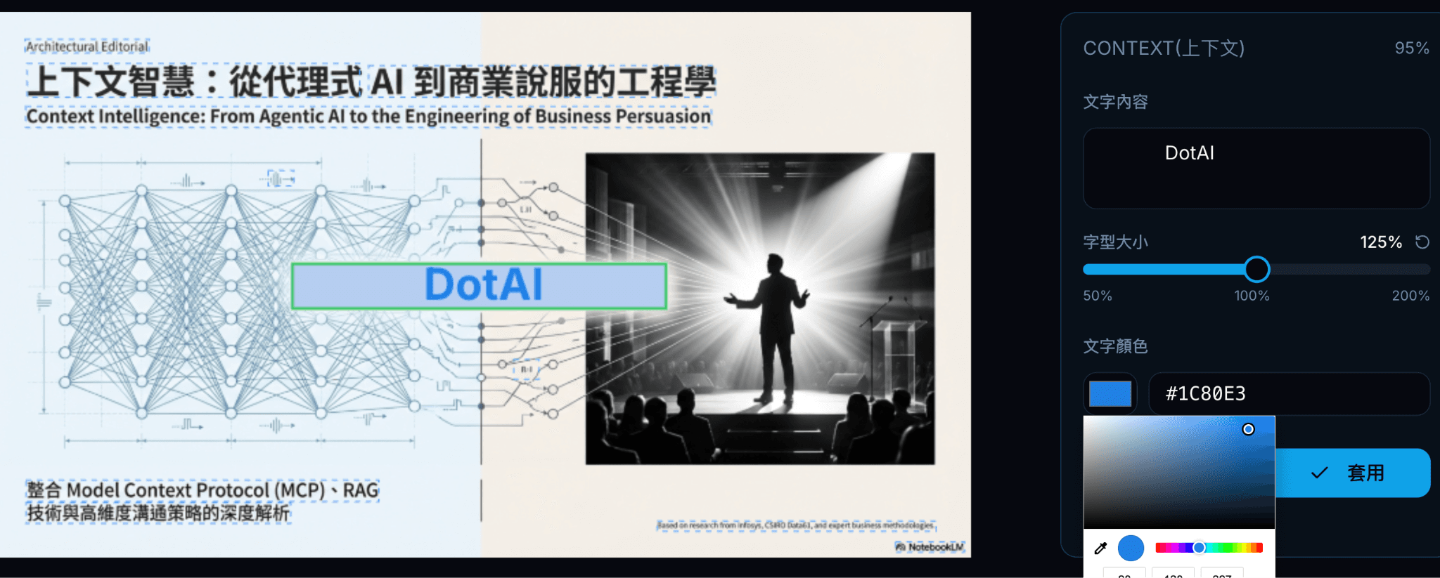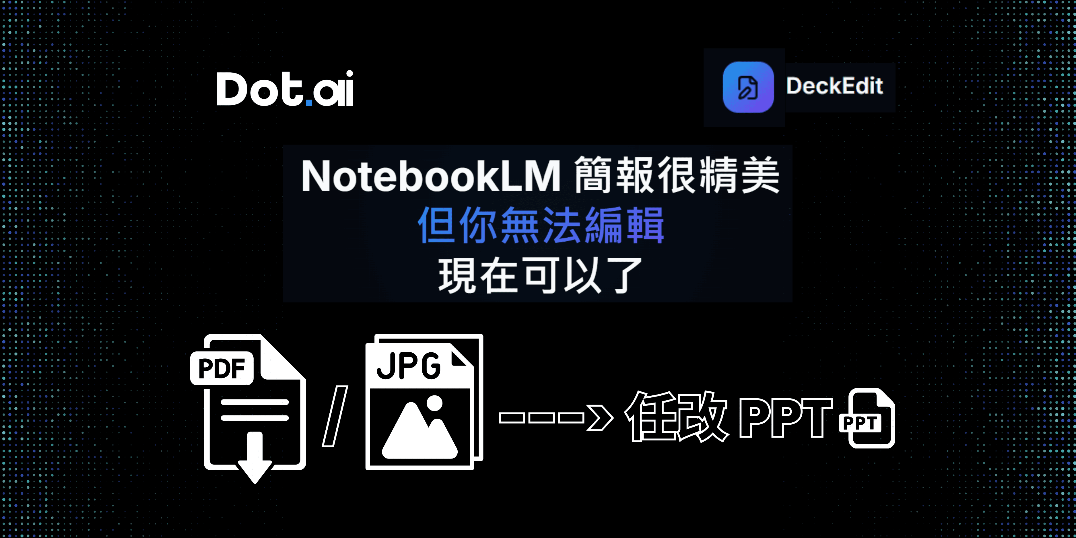 我們 DotAI 團隊觀察到,Google NotebookLM 的簡報生成功能雖然大幅簡化了製作流程,但目前輸出的檔案格式卻是「死」的——無法選取文字、無法修正錯字,更無法客製化內容。對於需要微調報告的職場人士來說,簡直是「睇得唔打得」。