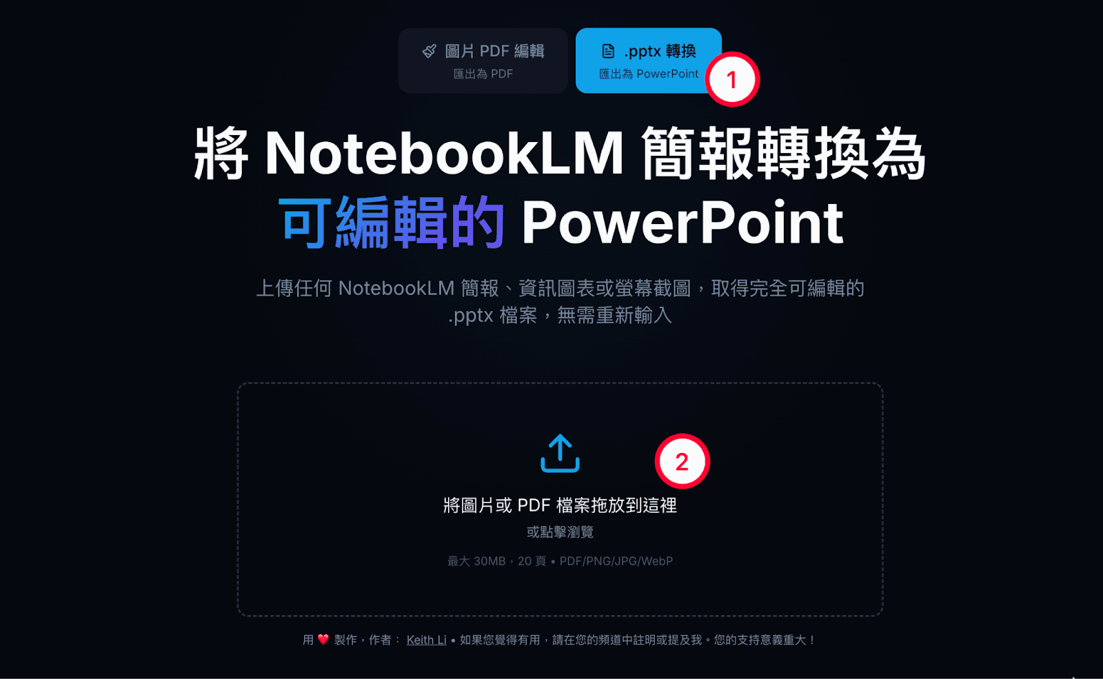 將 NotebookLM 生成的靜態文件拖入,檔案上限為 30MB,每個文件最多支援 20 頁。