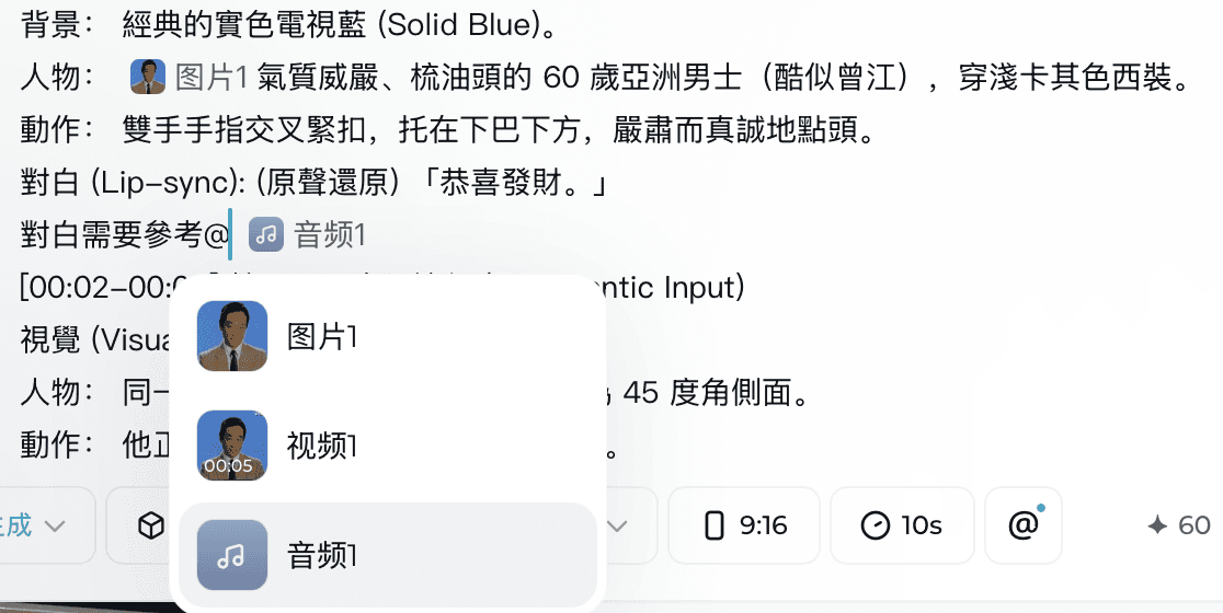 鏈接素材 (The @ Technique):在輸入框輸入 「@」,手動勾選你上傳的圖片、影片與音軌。