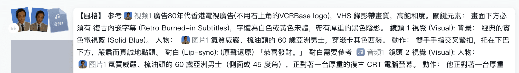 我們的指令寫法與大眾不同,採用「視覺-動作-影音」的結構化描述,這能讓 AI 邏輯更清晰: