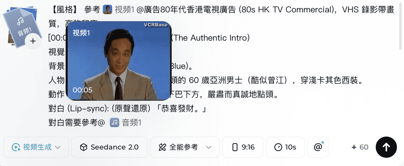 透過 @圖片 參考,AI 會直接提取五官特徵進行「降維打擊」般的還原,繞過所有關鍵字審核,同時確保全片人物形象始終如一。