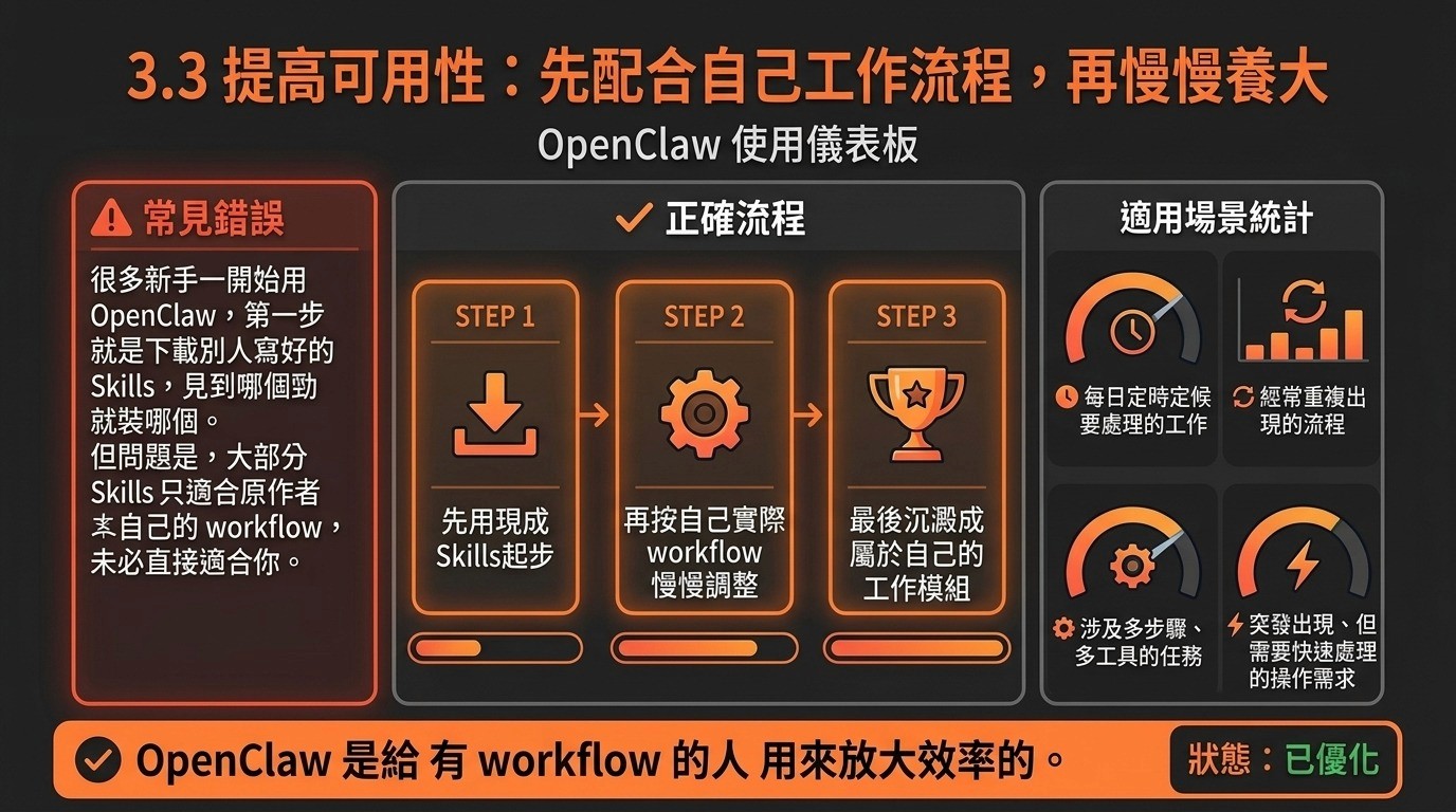 很多新手一開始用 OpenClaw,第一步就是下載別人寫好的 Skills,見到哪個勁就裝哪個。但問題是,大部分 Skills 只適合原作者自己的 workflow,未必直接適合你。