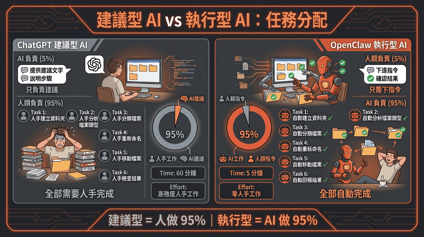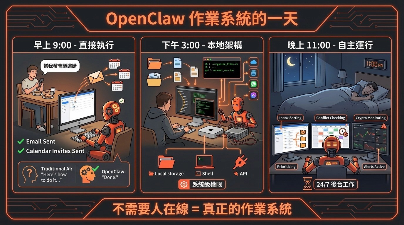 從「建議」到「執行」: 傳統 AI 告訴你「如何寫郵件」,而 OpenClaw 則直接「代你發送郵件」 。