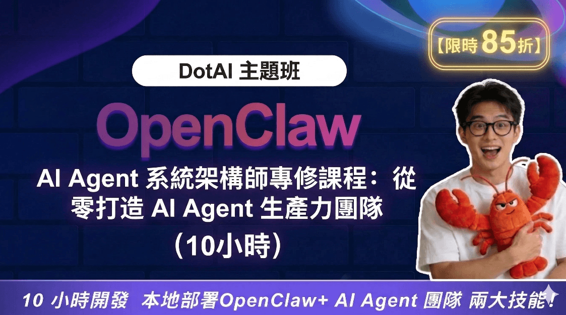 如果你不想慢慢消化網上碎片化攻略,DotAI 也推出了《 OpenClaw AI Agent 系統架構師專修課程:從零打造 AI Agent 生產力團隊 》 ,以 10 小時實體課形式,帶學員由安裝與環境配置,一路走到 Skills、多智能體工作流與企業部署思維,目標是幫你由「識用 AI」升級到「識設計 AI 系統」。