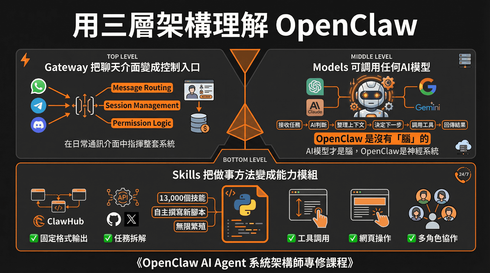 要真正掌握 OpenClaw 為何能超越傳統聊天機器人,我們必須打開它的引擎蓋,了解其底層邏輯。它並非一個無法解析的黑盒子,而是由三個層次分明、各司其職的核心模組所構成:Gateway(通訊閘道)、Models(語言模型)與 Skills(技能模組)。這套「三層架構」的精準分工,正是它能具備極高擴充性與強大執行力的秘密所在: