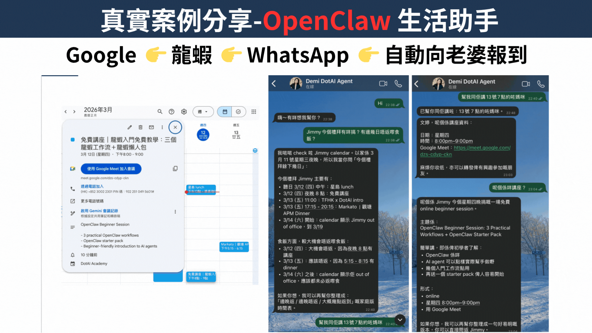 AI 做咩: 幫你安排 Google Calendar、加入 Google Meet、推送提醒;亦可將藥物照片與口頭說明整理成教學短片與定時提醒。