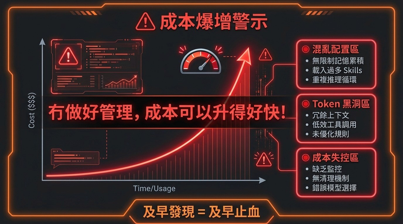 所以,如果你冇做好記憶管理、skills 控制同 prompt 精簡,成本係可以升得好快。最極端嘅情況下,每一輪對答都可能去到十幾蚊甚至更高,並唔誇張。