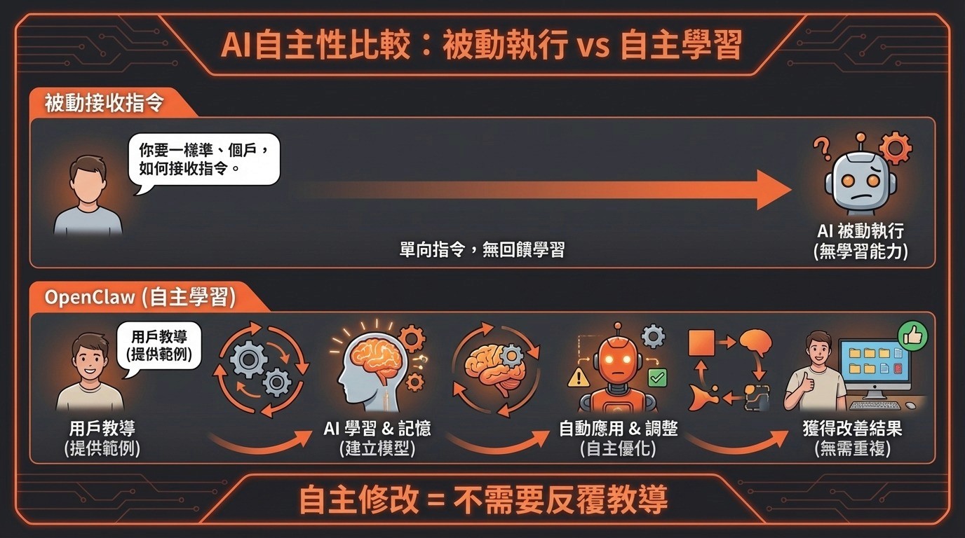 當然,這並不是模型突然自己進化,而是因為 OpenClaw 可以透過記憶、規則、偏好與 learnings,慢慢建立一套可延續的工作方式。當你持續整理背景資訊、修正行為、沉澱 workflow,它就不再只是回應你當下的一句 prompt,而是開始愈來愈接近你真正想要的做法。
