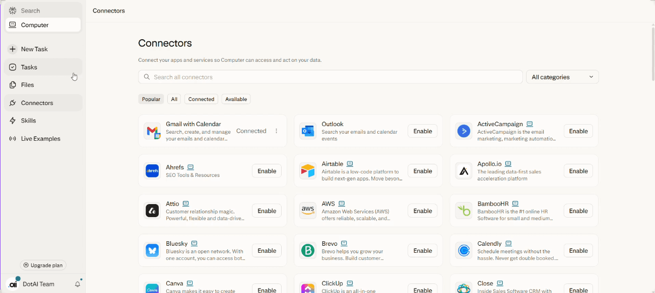 只能在界面中使用使用AI模型實時搜索信息並整合: ![]() | connectors中所顯示的所有清單均可連接: ![]() |